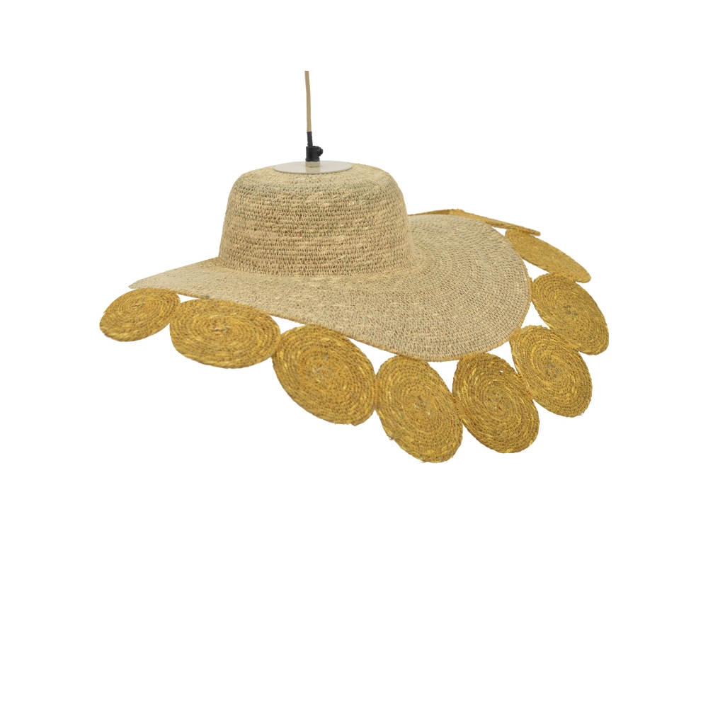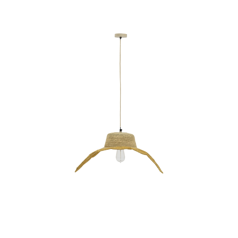 Τεχνικά χαρακτηριστικά: * Κατασκευή από μέταλλο και γιούτα.Η γιούτα είναι μια από τις πιο προσιτές φυσικές ίνες και δεύτερη μετά το βαμβάκι στην ποσότητα που παράγεται και στην ποικιλία της χρηστικότητάς του. Οι ίνες από γιούτα αποτελούνται κυρίως από φυτικά υλικά κυτταρίνη και λιγνίνη. Η γιούτα ονομάζεται επίσης “χρυσή ίνα” για το χρώμα και την μεγάλη αντοχή της. * Ο σχεδιασμός του καπέλου επιτρέπει στο φως να διαχέεται εκπληκτικά όταν το φωτιστικό είναι σε λειτουργία. * Φέρει θέση για έναν λαμπτήρα Ε27 ο οποίος δεν συμπεριλαμβάνεται στη συσκευασία. *Μέγιστη κατανάλωση 10 Watt * Προσφέρεται σε χρώμα φυσικό