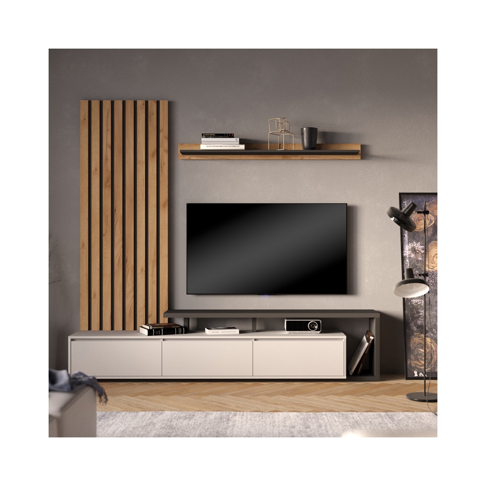 Τεχνικά χαρακτηριστικά: • Κατασκευή από μοριοσανίδα με επένδυση μελαμίνης υψηλής ποιότητας, με αντοχή στην καταπόνηση, την φθορά και τον χρόνο. • Όλα τα υλικά που χρησιμοποιούνται στην παραγωγή συμμορφώνονται με τα πρότυπα περιβάλλοντος και υγείας των παιδιών με βάση τα ευρωπαϊκά πρότυπα ποιότητας Ε1. • Προσφέρεται σε ανθρακί-sonoma χρώμα. • Φέρει ράφι για τις ηλεκτρονικές συσκευές καθώς και τρία ντουλάπια για την αποθήκευση μικροαντικειμένων. • Επιπλέον φέρει ένα επιτοίχιo ράφι για την προβολή των διακοσμητικών και βιβλίων.
