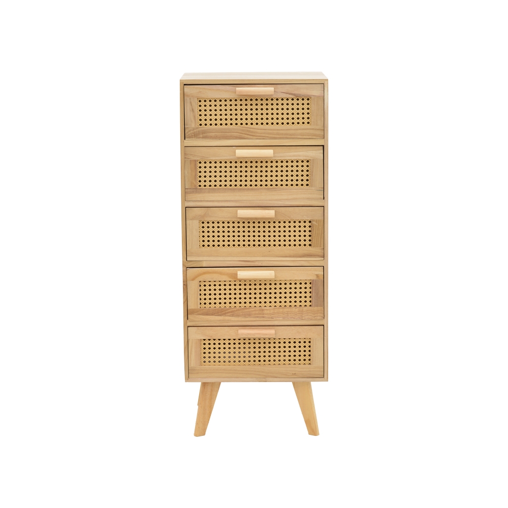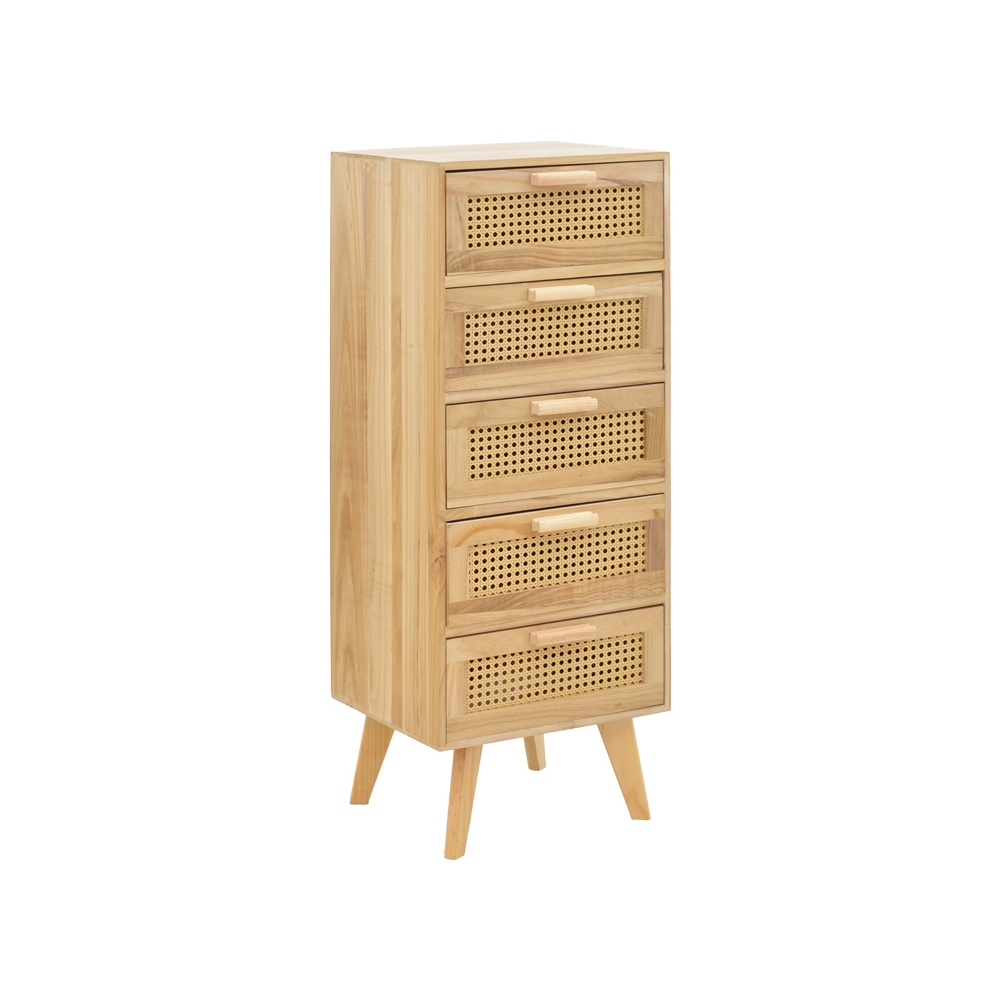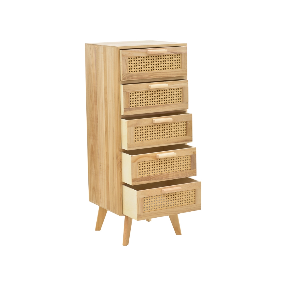 - Διαθέτει πέντε συρτάρια για κλειστή αποθήκευση αντικειμένων. Στο εξωτερικό των συρταριών γίνεται χρήση και του υλικού rattan. Το ράταν είναι ένας τύπος υλικού που προέρχεται από τη φλοιώδη επιφάνεια ορισμένων ειδών φυτών, κυρίως από φυτά της οικογένειας των Calameae, που περιλαμβάνει πολλά είδη που ανήκουν στην οικογένεια των palmaceae και των άλλων φυλλών. Συχνά χρησιμοποιείται για την κατασκευή έπιπλων, καλαθιών, στολισμών και άλλων ειδών χειροτεχνίας λόγω της ευελιξίας και της ανθεκτικότητάς του