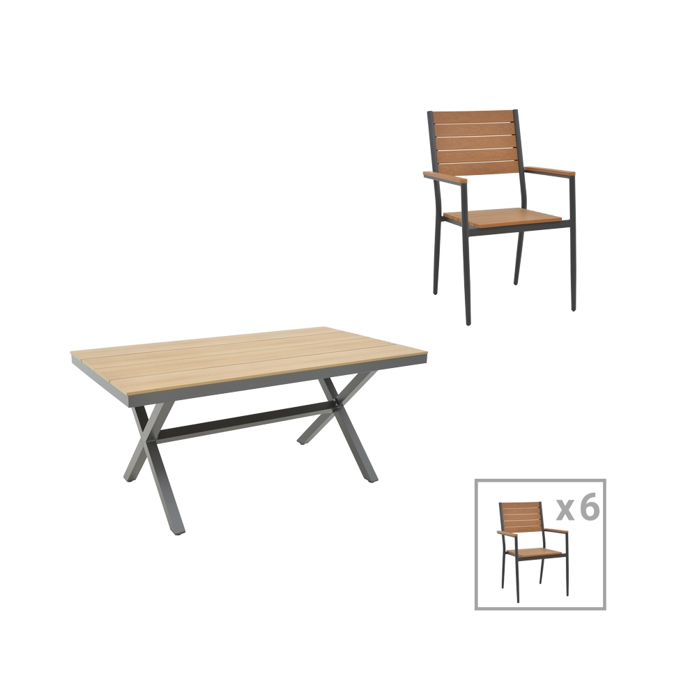 Τραπεζαρία Vitality-Thorio σετ 7τεμ pakoworld ανθρακί αλουμίνιο και plywood σε φυσική απόχρωση 160x90x75εκ