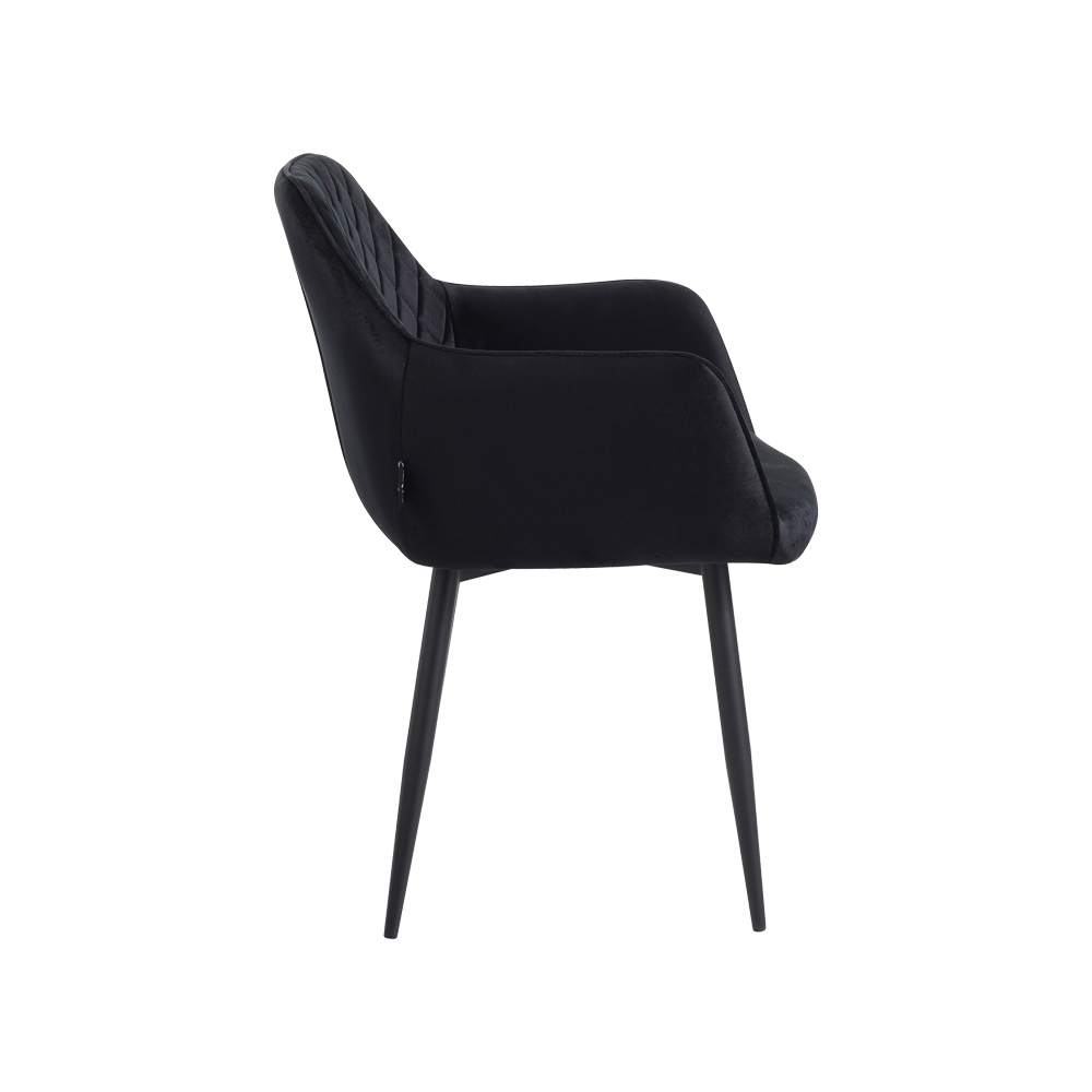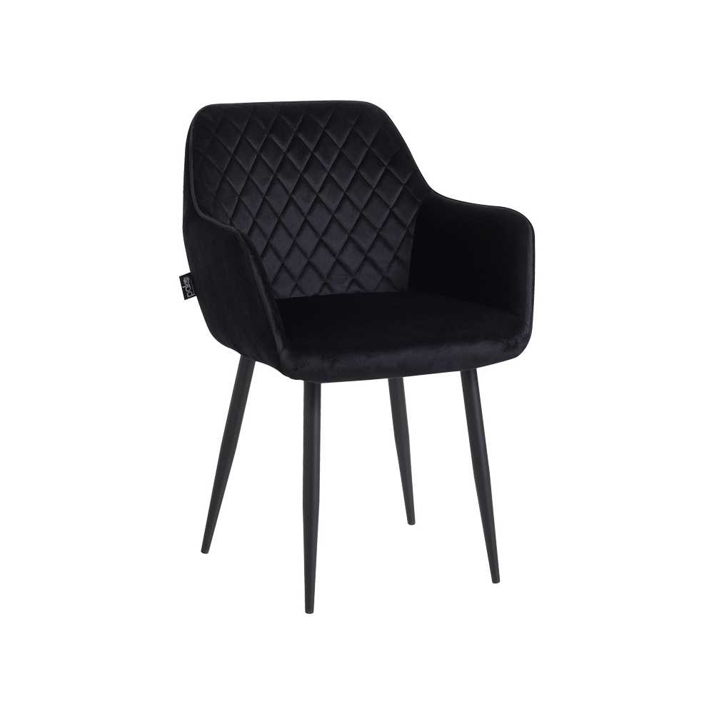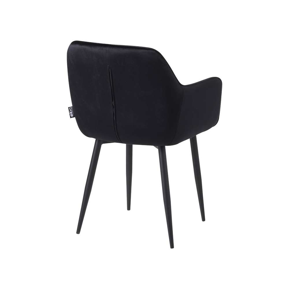 Τεχνικά χαρακτηριστικά: *Πλάτη και έδρα ενιαία, με επένδυση βελούδο υφάσματα άριστης ποιότητας με μεγάλη ανθεκτικότητα και αντοχή στη φθορά. Το βελούδο είναι ένα ύφασμα με κοντές, πυκνές ίνες, συνήθως από μετάξι, βαμβάκι ή συνθετικά υλικά. Έχει μια απαλή, λεία υφή και μια πλούσια, γυαλιστερή εμφάνιση. Χαρακτηρίζεται για την πυκνότητα του και την απαλότητά του. *Ο σχεδιασμός της ακολουθεί την σπονδυλική στήλη, στηρίζοντας τη μέση με την μοντέρνα καμπύλη μορφή της. *Στήριξη σε ενισχυμένο σκελετό που καταλήγει σε τέσσερα μεταλλικά πόδια εξαιρετικής ποιότητας και αντοχής, στο βάρος και στο χρόνο. *Προσφέρεται σε χρώμα μαύρο.