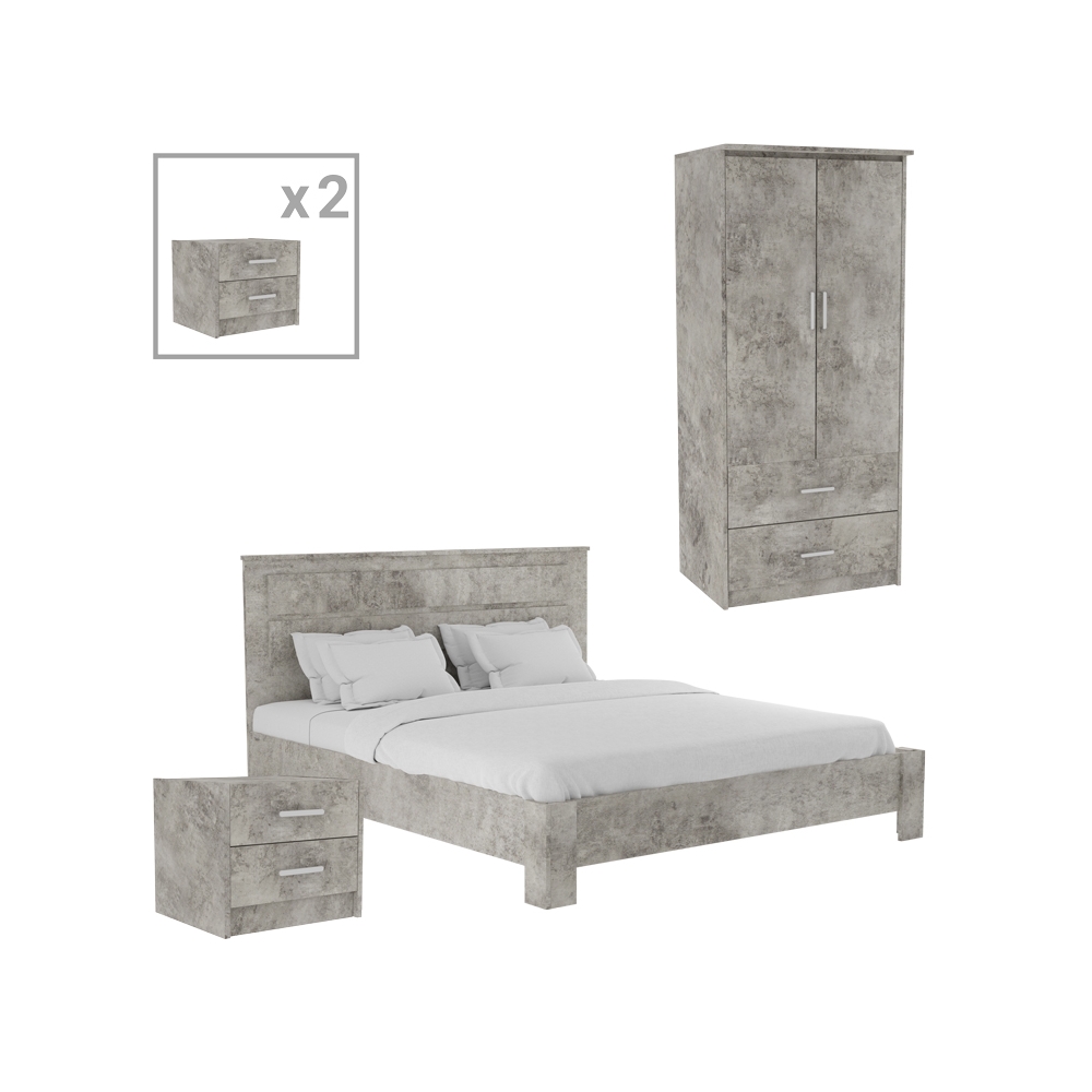 Το σετ περιλαμβάνει μια ντουλάπα, δύο κομοδίνα και ένα κρεβάτι.