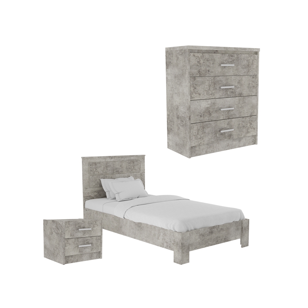 Το σετ περιλαμβάνει ένα κομοδίνο, ένα κρεβάτι και μία συρταριέρα.