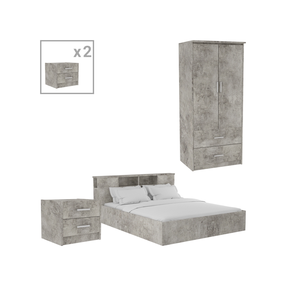 Το σετ περιλαμβάνει δύο κομοδίνα, ένα κρεβάτι και μία συρταριέρα.