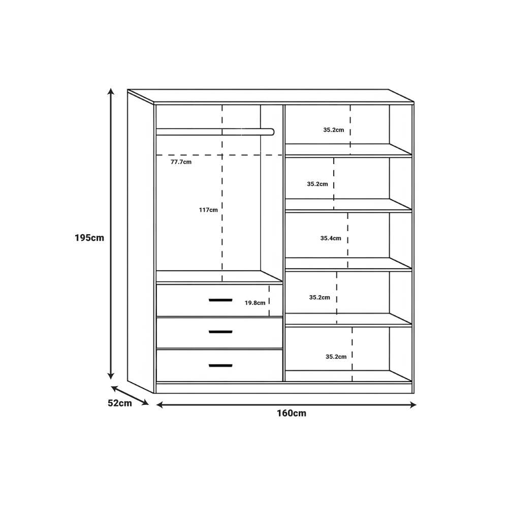 - Περιλαμβάνει τέσσερις πόρτες και τρία μεγάλα συρτάρια για την αποθήκευση ρούχων και αξεσουάρ.